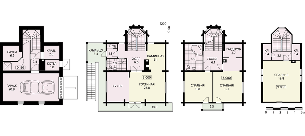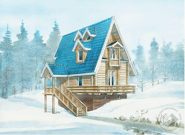 Своеобразие облика этого рубленого дома, похожего на сказочный терем, в удачном соотношении минимального пятна застройки к общей площади помещений, высокая степень вариабельности как внешних габаритов сруба, так и жилых комнат. Вынесение внутренней лестницы за пределы основного объема сруба (7 х 7 м) позволило обогатить объемно-пространственное решение квадратного в плане дома и разнообразить внутренние пространства. Печь, «работающая» на все помещения в доме, при желании может быть заменена на водогрейный двухфункциональный котел. Проект может подойти и для семьи со средним уровнем доходов, так как дом экономичен и прост в возведении.