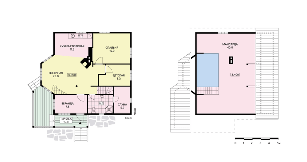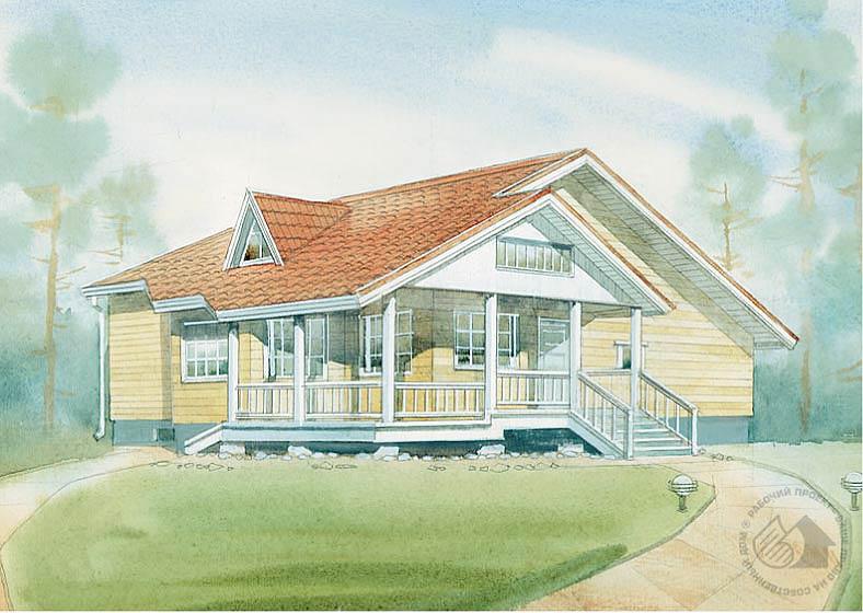 Компактный деревянный дачный дом рассчитан как на сезонное, так и на круглогодичное проживание и отдых небольшой семьи. Дом подходит для строительства на любых грунтах, на участке с незначительным перепадом рельефа. В случае ярко выраженного рельефа и при низком уровне грунтовых вод возможно устройство заглубленного цокольного этажа. При небольших внешних габаритах дома (спальни первого этажа уже частично перекрываются совмещенной кровлей) внутреннее пространство воспринимается единым и значительным, а струганый брус в интерьере не требует дополнительных отделочных работ внутри помещений. При нехватке жилых площадей можно оборудовать мансардное пространство и использовать его как спальную зону.