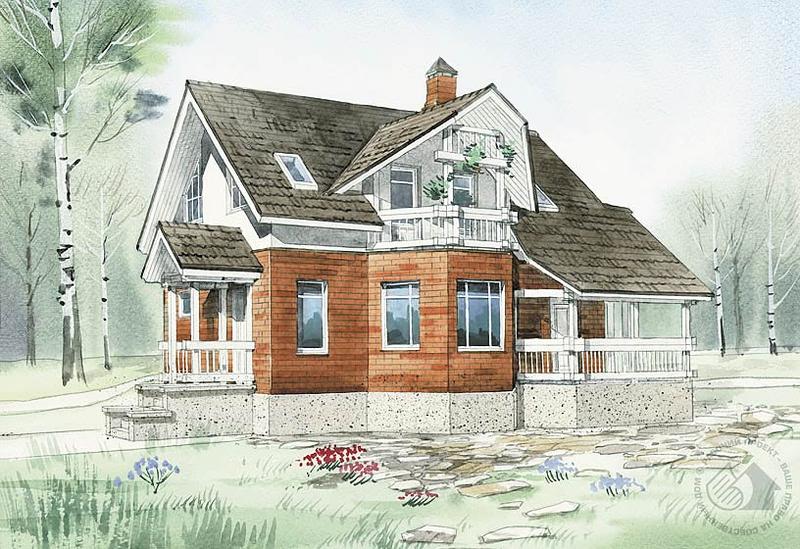 Экономичность и простота – ключевые слова, характеризующие принцип планировочного решения этого дома. Традиционный внешний вид дома органично сочетается с современными приемами организации пространства. Большая гостиная с трехгранным эркером – не только самая парадная комната дома, она связывает помещения как первого, так и второго этажа. В санузел первого этажа можно попасть из тамбура. Просторная крытая терраса является продолжением гостиной и хороша для отдыха и общения семьи летом. Ее можно остеклить, получив таким образом дополнительное помещение дома. Логичность и простота планировки не исключают некоторой функциональной корректировки планов.