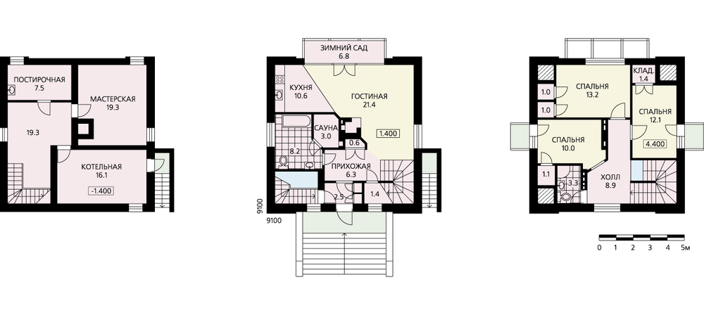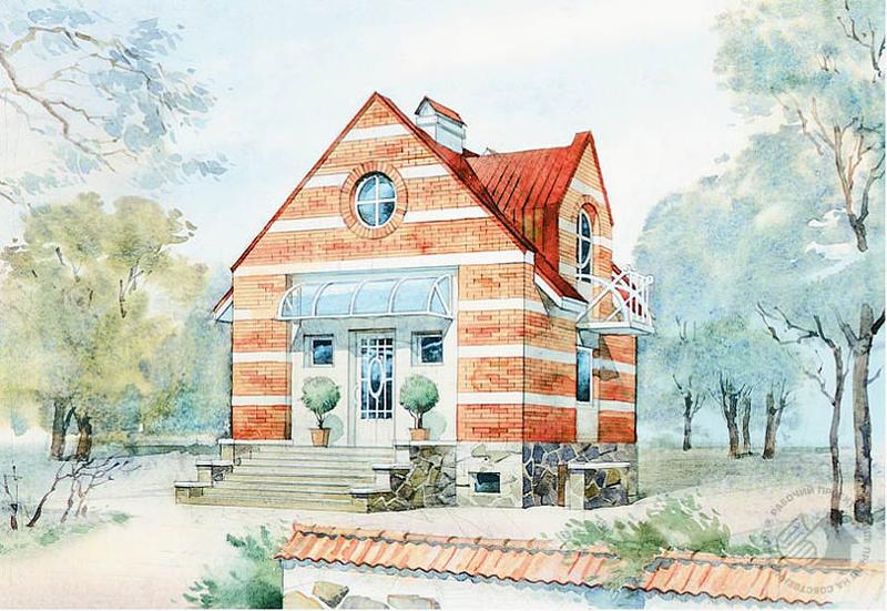 Hебольшой кирпичный дом отличается простотой формы и конструктивного решения в сочетании с удобной современной планировкой и высоким уровнем комфорта. В цокольном этаже расположены котельная, постирочная и мастерская. Первый этаж отличает свободная планировка жилого пространства. Пристроенный со стороны кухни зимний сад можно преобразовать в открытую террасу. Большую роль в формировании внешнего облика дома играют цветовое решение фасадов, кровли и козырьки необычной дугообразной формы.