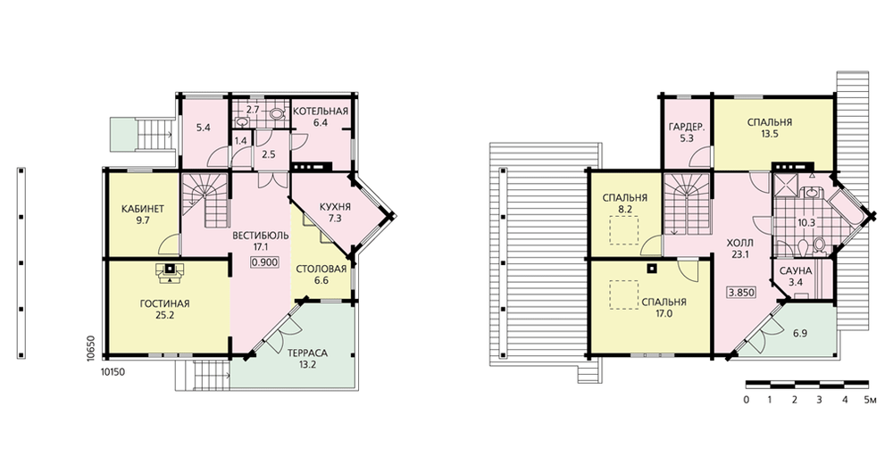 Двухэтажный деревянный дом привлекает к себе внимание гармоничным сочетанием традиций деревянного зодчества и технологий современного коттеджного строительства. Отличительной чертой планировки первого этажа являются свободно перетекающие пространства большого светлого вестибюля, гостиной, кухни и лестничного холла. Все эти помещения образуют единое пространство. Второй этаж представляет собой классический вариант планировки с высоким уровнем комфорта и рациональным использованием площадей. Три спальни группируются вокруг большого светлого холла. Комфортабельность проживания обеспечивается здесь наличием большой ванной комнаты и сауны.