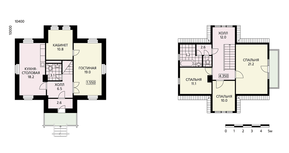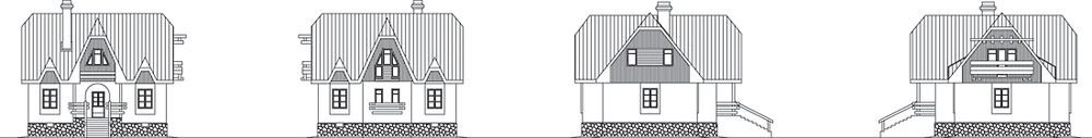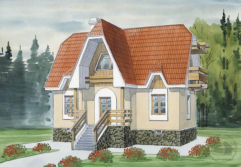 В доме два жилых уровня: первый этаж с просторными помещениями гостиной, кухни-столовой, кабинетом; второй – мансардный, со спальнями и ванной. Входной тамбур оборудован встроенными шкафами. Водогрейный котел может располагаться и при кухне, а под лестницей, со стороны кабинета, можно устроить небольшую кладовую. Принятая конструктивная схема дома позволяет обойтись без внутренних несущих стен, что дает максимальную свободу для изменения планировки. Под всем домом есть технический подпол. Небольшое заглубление подземной части дома делает этот проект универсальным, пригодным для строительства как на сухих участках, так и, при необходимости, на площадках с высоким уровнем грунтовых вод.