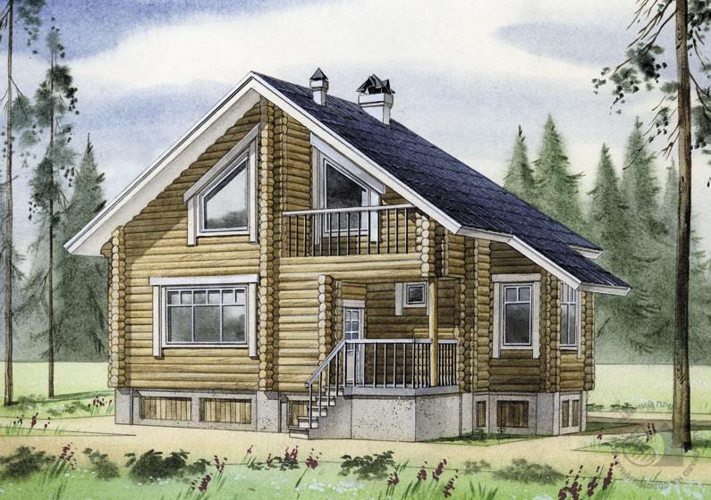 Деревянный бревенчатый дом, в котором удачно сочетаются традиционный и современный подходы в организации загородного жилья. Планировка дома удобна как для сезонного, так и для постоянного проживания небольшой семьи и приема гостей. Компактный тамбур при входе защищает от холодного воздуха с улицы. Для дополнительной защиты можно поставить еще одну дверь во втором, промежуточном с гостиной тамбуре. Главное место на первом этаже занимает пространство, образованное гостиной, столовой, кухней-нишей и холлом. В гостиной вокруг камина может собираться вся семья. Рядом находится большая светлая столовая, смежная с кухней. Жилая комната, расположенная на первом этаже, может служить кабинетом хозяина дома или спальней старших членов семьи. В мансарде предусмотрены две спальни и библиотека.