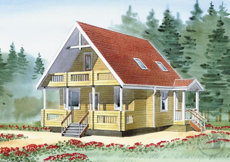 Внешне традиционно решенный дом из бруса обладает тем не менее оригинальной, современной планировкой. Да и его функциональное назначение неоднозначно. Дом может не только служить жильем для небольшой семьи, но и использоваться как место отдыха сотрудников небольшой преуспевающей фирмы. Состав помещений и планировка как нельзя лучше способствуют этому: значительную часть площади занимает зона релаксации с сауной и бассейном. Она выделена в самостоятельный блок, имеет отдельный вход и может самостоятельно функционировать, бассейн от каминной отделен остекленной перегородкой. Площадь мансардного этажа строго поделена между двумя спальными комнатами и галереей второго света гостиной, из которой можно попасть на большой крытый балкон.
