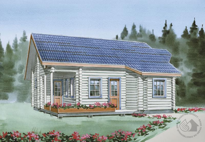 Одноэтажный бревенчатый дом с мансардой – красивый, уютный, комфортный дом для сезонного отдыха или постоянного проживания небольшой семьи. К его достоинствам можно отнести большие крытые террасы первого этажа и балкон второго. Эти площади – гармоничное и такое приятное дополнение к жилым помещениям дома. Вся основная жизнь его обитателей сосредоточена на первом этаже. Здесь расположены просторная гостиная, смежная с ней кухня, две спальные комнаты и сауна с душевой. Из гостиной и сауны есть выходы на террасу. По небольшой отрытой лестнице можно подняться на мансарду, в проекте это единое спальное помещение. При желании его можно разделить перегородками и получить две или три небольшие жилые комнаты, правда, это потребует организации дополнительного верхнего освещения.