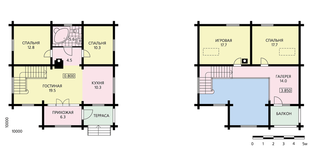 Компактный бревенчатый дом для сезонного проживания небольшой семьи. И внутренняя планировка, и объем дома решены очень лаконично и рационально. Если строительство дома предполагается в холодной климатической зоне, небольшую прихожую желательно превратить в изолированный тамбур, отделив от гостиной теплой перегородкой с дверью. Гостиная и столовая составляют единое пространство, из которого можно попасть во все помещения дома. Через небольшой холл можно пройти в спальную зону первого этажа или, поднявшись по открытой лестнице, очутиться на мансарде. Здесь предлагается оборудовать одну спальню и игровую, которая, впрочем, также может использоваться как спальная комната. С галереи открывается вид на второй свет гостиной, с нее же можно выйти на балкон.