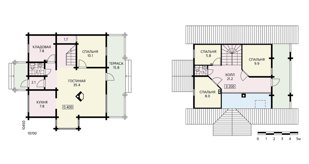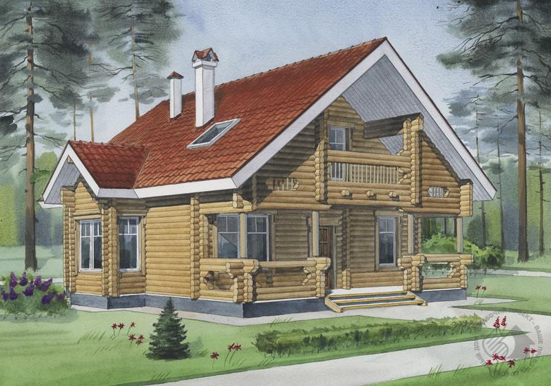 В основе этого проекта – «классическая» русская бревенчатая изба, трансформированная в современное комфортабельное жилище. Такой дом подойдет как для постоянного проживания, так и в качестве дачного коттеджа для небольшой семьи. К несомненным достоинствам можно отнести и его экологичность. В доме один этаж и жилая мансарда. Большую часть первого этажа занимает просторная гостиная. Необычным и очень интересным кажется местоположение камина в самом ее центре. Смежно с гостиной расположена спальня. В мансардном этаже расположены три спальни и санузел. По контрасту с миниатюрными спальнями здесь запроектирован большой холл, с которого открывается вид на второй свет гостиной и есть выход на балкон. Снаружи бревенчатые стены можно тонировать, как показано на рисунке, и они будут иметь естественный цвет древесины, а можно окрасить их в любой понравившийся заказчику цвет.