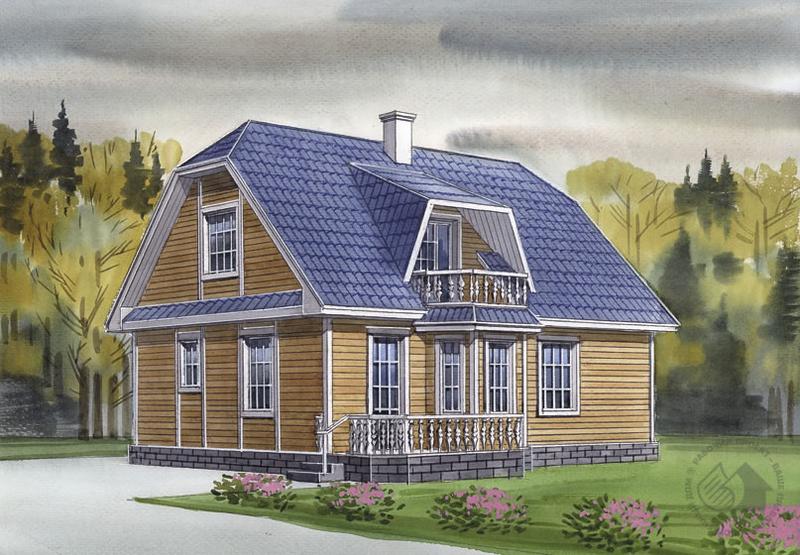 Дом из бруса с простой и четкой объемно-планировочной структурой, традиционной для деревянных домов такого класса. План приближен к квадрату, на первом этаже одна несущая продольная стена. Слуховые окна пластически обогащают простую полувальмовую кровлю. В доме нет заглубленного цокольного этажа, но очень активно используется мансарда. Строгую геометрию плана нарушает курданер входной зоны и эркер гостиной. К столовой примыкает открытая терраса, крыльцо же при входе защищено навесом. Основные помещения первого этажа – гостиная и кухня-столовая, лишь условно разделенные камином и перегородкой. Здесь же находятся небольшая спальня и ванная комната. Мансардный этаж – приватная зона дома с двумя спальнями, ванной и гардеробной. Небольшой уютный балкончик – приятное дополнение этой комфортной планировки.