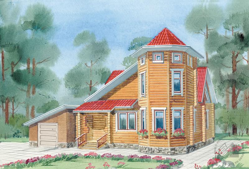 Бревенчатый дом с пятигранной башней и пристроенным гаражом, рассчитанный для строительства на участке с перепадом рельефа. Башня с шатровой кровлей – основная архитектурная доминанта, формирующая облик дома. Гараж по проекту не является неотъемлемой частью дома, его наличие или отсутствие определяет сам заказчик. Причем отсутствие гаража на облике дома скажется скорее положительно, чем негативно. Гараж вполне может быть отдельно стоящим сооружением. Жилая часть дома частично одноэтажная с мансардой, частично, в башне, – двухэтажная. В доме есть не показанный на планах подвал, куда вынесены технические службы. Центральное место на первом этаже занимает гостиная – большое, светлое помещение с двусторонним освещением и камином. Смежно с ней расположена кухня, из просторного холла по лестнице можно попасть на мансарду.