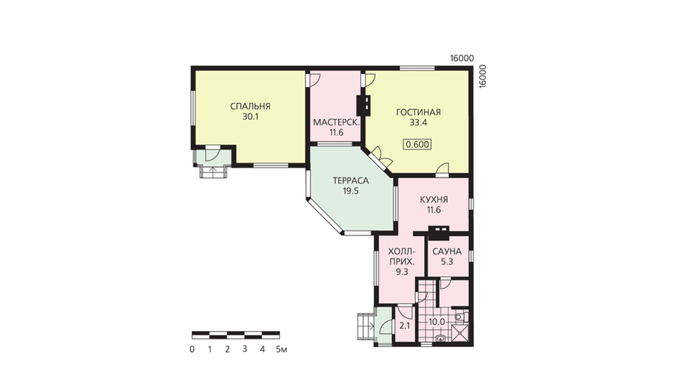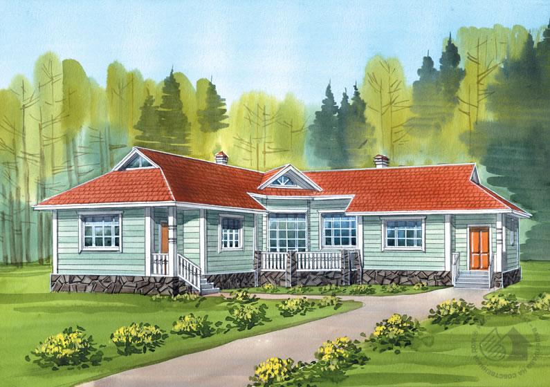 Проект дома для отдыха. Дома такого назначения становятся все более популярны и востребованы. Их особенность заключается в том, что наряду со стандартным набором жилых помещений большое место здесь отводится зоне релаксации. В данном проекте жилая часть представлена просторной угловой гостиной с камином, кухней и спальней. Небольшое помещение между гостиной и спальней может быть использовано по усмотрению хозяев дома. Из гостиной есть выход на террасу, которая решена как уютный внутренний дворик. Зона релаксации находится непосредственно вблизи от входа в дом и включает в себя сауну, душевую и общий для всего дома холл. Планировка дома решена так, что обе эти части могут существовать автономно и использоваться независимо друг от друга, а могут составлять единое целое. В доме нет подвала, лишь небольшие технические приямки. На чердак можно попасть через люк в прихожей.
