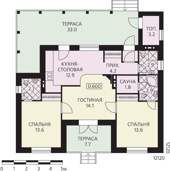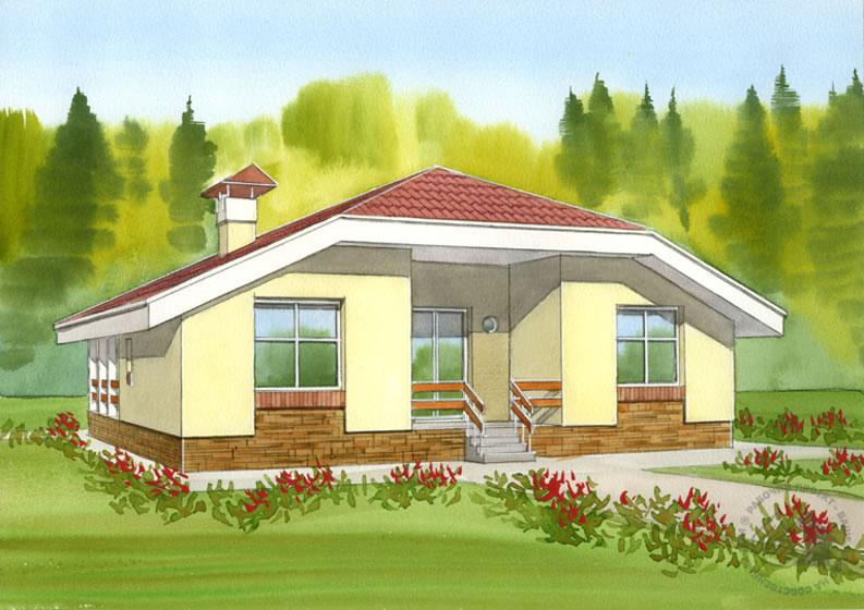 Этот небольшой одноэтажный дом очень удобен для отдыха на природе. Расположение всех помещений на первом этаже, практически на уровне земли, не отрывает внутреннее пространство дома от внешней среды. А на просторных, крытых террасах можно расположиться даже в плохую погоду. Планировка решена так, что не пропадает ни один сантиметр площади, все используется очень рационально. Прихожая, кухня-столовая и гостиная решены как единое помещение, которое, в свою очередь, является транзитной зоной. Через кухню-столовую можно пройти в гостиную, а через нее попасть в спальни или выйти на террасу. Эта терраса решена очень интересно, как небольшой внутренний дворик. Экономия на коридорах и холлах позволила разместить в таком небольшом доме две душевые, санузел и даже сауну. Топочная вынесена за общий контур дома.