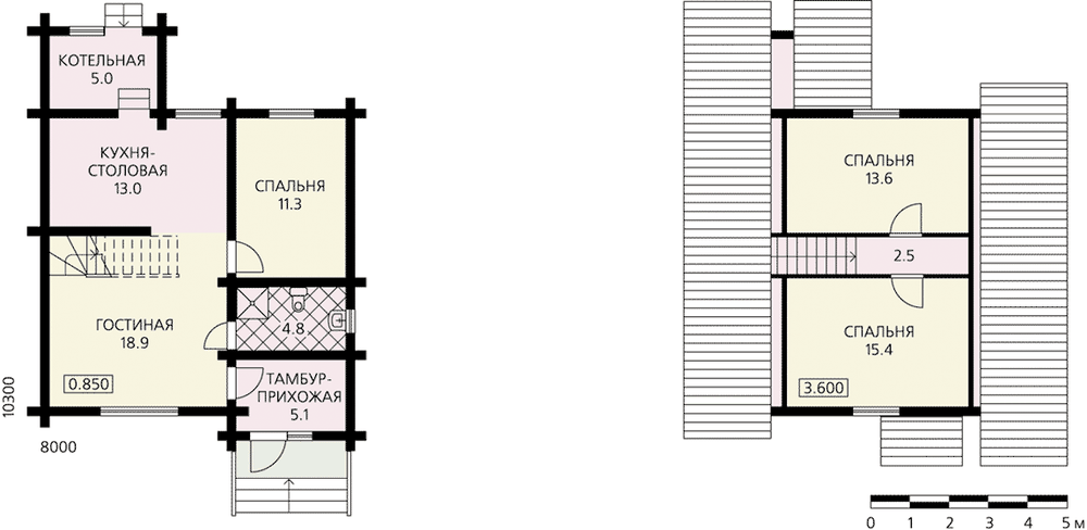 Небольшой уютный бревенчатый дом для сезонного проживания интересен тем, что имеет два совершенно равноценных входа с противоположных фасадов. Это очень удобно при размещении дома на узком участке, когда оба эти фасада выходят на улицы. При этом два боковых фасада практически полностью глухие, что позволит расположить вблизи него другие постройки или сделать пристройку непосредственно к самому дому. В планировочном решении дом традиционен. На первом этаже расположена гостиная с открытой деревянной лестницей в мансарду, кухня-столовая и небольшая жилая комната. В мансарде запроектированы еще две спальни. Отсутствие подвала, чердака и каких-либо транзитных зон в виде коридоров и холлов делает решение этого дома экономичным и вполне доступным для небольшой семьи со средним достатком.