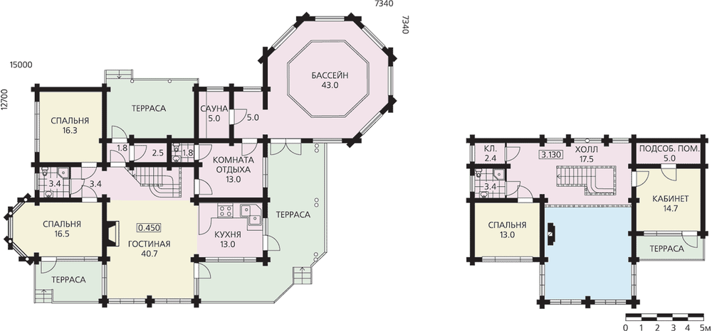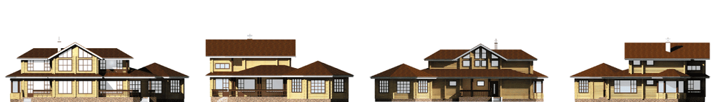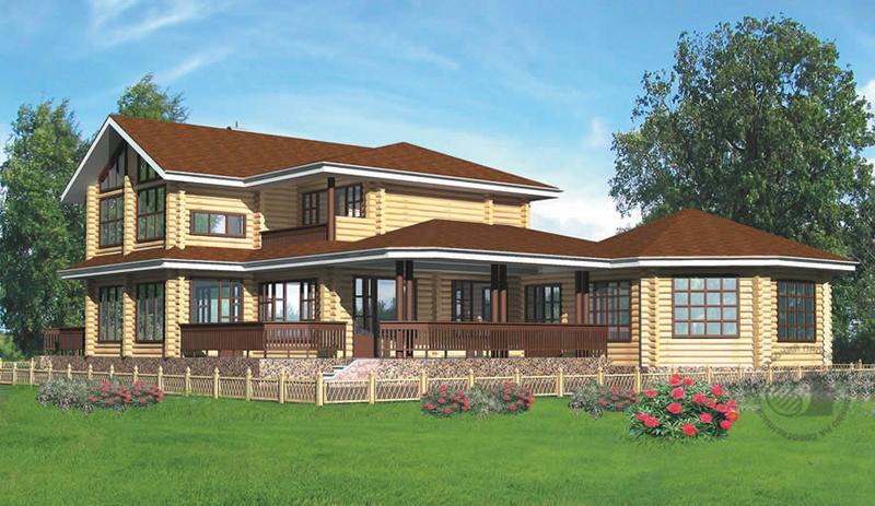Великолепный образец дома для отдыха. Бревенчатый сруб обеспечит экологичность и комфортность, большие крытые террасы позволят проводить время на открытом воздухе в любую погоду, а бассейн и сауна помогут расслабиться и полноценно отдохнуть. Основные помещения дома на первом этаже дополнены двумя спальнями мансарды. Подвал в доме отсутствует, невысокое чердачное пространство не эксплуатируется. Нетривиально и очень интересно решен бассейн. Он расположен в многограннике угловой пристройки и связан с жилой частью дома через комнату отдыха. При желании от бассейна можно отказаться, не нарушив при этом целостности всего дома. Жилая зона первого этажа представлена большой, двусветной гостиной с камином, смежной с ней кухней и двумя спальнями. Спальни несколько отнесены от гостевой зоны, имеют свой небольшой холл и санитарный блок. Такое зонирование логично, удобно и обеспечивает необходимый уровень комфорта.