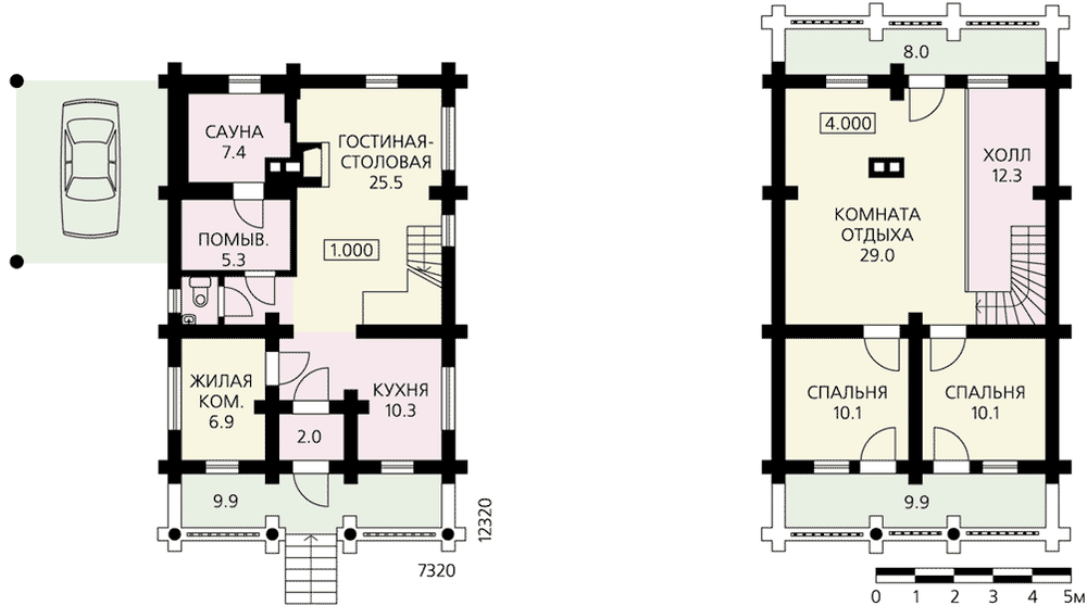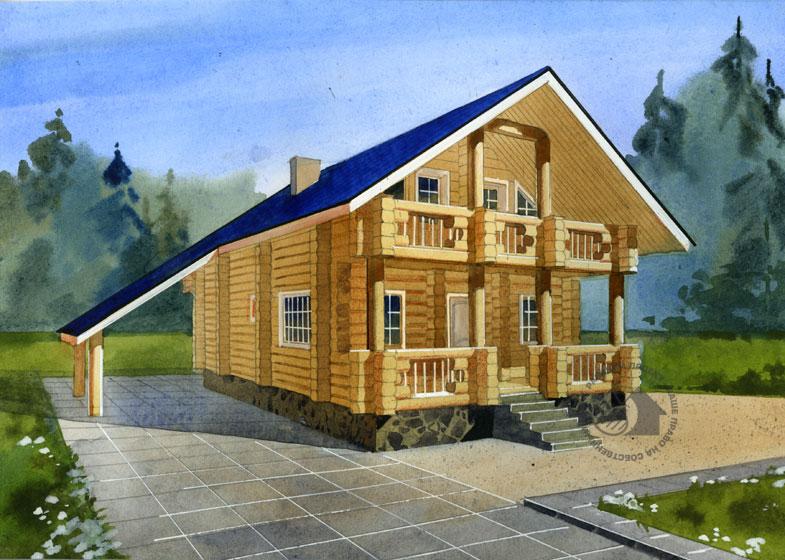 Небольшой по площади, но очень комфортабельный бревенчатый дом. На одном этаже и в мансарде помимо традиционных гостиной, кухни и спальных комнат удалось разместить кабинет и сауну. В дополнение к этому проектом предусмотрены навес для машины и просторные террасы. Классический образец комфортабельного дома для отдыха, который, впрочем, можно использовать и как постоянное жилье для небольшой семьи, тем более что предложенная планировка имеет определенный ресурс. Так большую часть мансарды занимает просторный холл. Это вторая гостиная, или комната отдыха, из которой открывается вид на гостиную первого этажа и из которой есть выход на балкон.