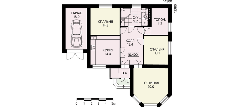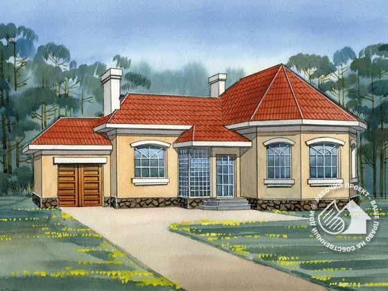 Одноэтажный дом с гаражом облик, которого формирует трехгранный эркер гостиной. Это самая выразительная архитектурная доминанта. Расположение всех помещений на одном этажа привело к формированию распластанного по земле плана, а соответственно большого пятна застройки, и уже как следствие необходимости большого участка под строительство. Эксплуатация чердака проектом не предусмотрена. Но при определенных мероприятиях – утеплении, освещении это вполне возможно. Тем более, что из помещения топочной предусмотрен лаз с выдвижной лестницей. В предложенном варианте дом больше подходит для строительства в теплой климатической зоне, ибо остекленный тамбур врят - ли будет надежной защитой от холода в суровые северные зимы. В этом случае потребуется другое решение входной зоны. Зато отсутствие цокольного этажа и небольшая глубина заложения фундамента позволит построить дом на сложных грунтах. Внутренняя планировка проста и логична. Вокруг центрального холла группируются все помещения дома: гостиная, кухня, две спальни, топочная и ванная комната.