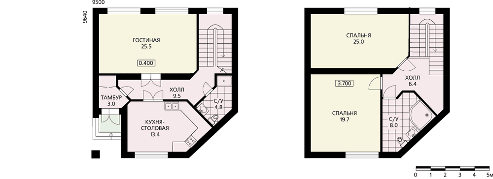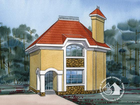 Небольшой, компактный, крепко сбитый домик. В плане он почти квадратный с одним срезанным углом. В планировке нет ничего лишнего, все решено по принципу необходимой достаточности. Подвал отсутствует, небольшой чердак не эксплуатируется. Вход в дом заглублен по отношению к главному фасаду и оформлен аркой. Планировка первого этажа представлена двумя основными помещениями: гостиной и кухней- столовой. В разделяющий их небольшой транзитный коридор выходят еще ванная комната и тамбур. Отсюда же по лестнице можно подняться на мансарду. Высота стены до наклона потолка составляет здесь 2.7 м, а высота помещения в чистоте 3.6 м. Посему мансардным этот этаж можно считать лишь условно, это практически полноценный второй этаж дома. Здесь расположены две спальни и ванная комната – простая, лаконичная планировка и при этом очень рациональная. Два боковых фасада в доме полностью глухие, это позволит вписать его в плотную застройку или даже рассматривать вариант блокировки. Правда в этом случае потребуется серьезная корректировка мансарды и чердака, включая и всю стропильную систему.
