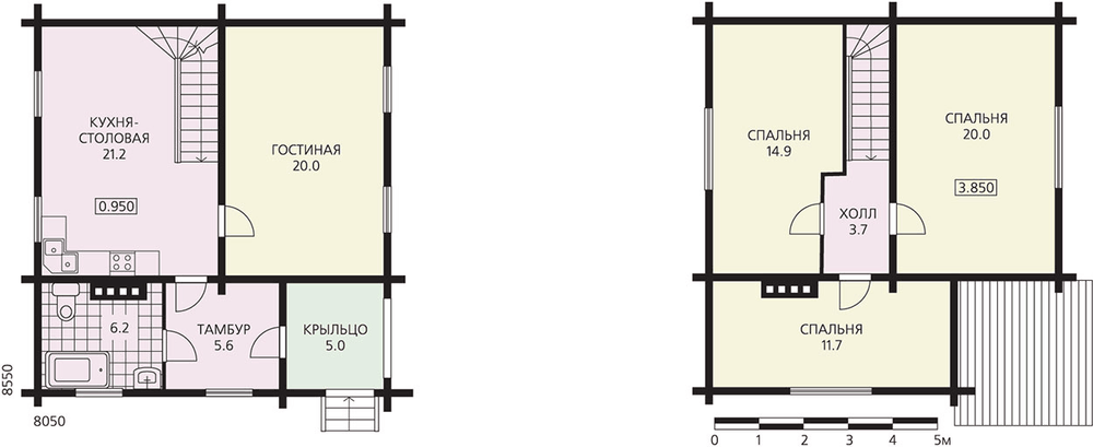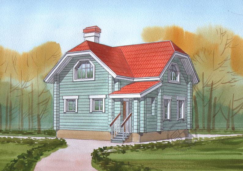 Небольшой дачный дом из бруса. Один этаж и мансарда, лаконичная планировка, непритязательные фасады – все вместе говорит о стремлении к рациональности, а следовательно, экономичности предложенного решения. Один полностью глухой фасад позволит максимально приблизить дом к границе участка или сделать к нему пристройку, например навеса для машин или гаража. На первом этаже расположены два жилых помещения, это небольшая гостиная и кухня-столовая. Из кухни-столовой деревянная лестница с забежными ступенями ведет в мансарду. Небольшая ванная и тамбур дополняют планировку этажа. Практически вся мансарда представляет собой жилую площадь, занятую тремя спальнями, исключение составляет лишь небольшой лестничный холл площадью 3.7 м2. Из него можно сделать лаз на чердак, хотя эксплуатация чердака проектом не предусмотрена. Подвал в доме отсутствует.
