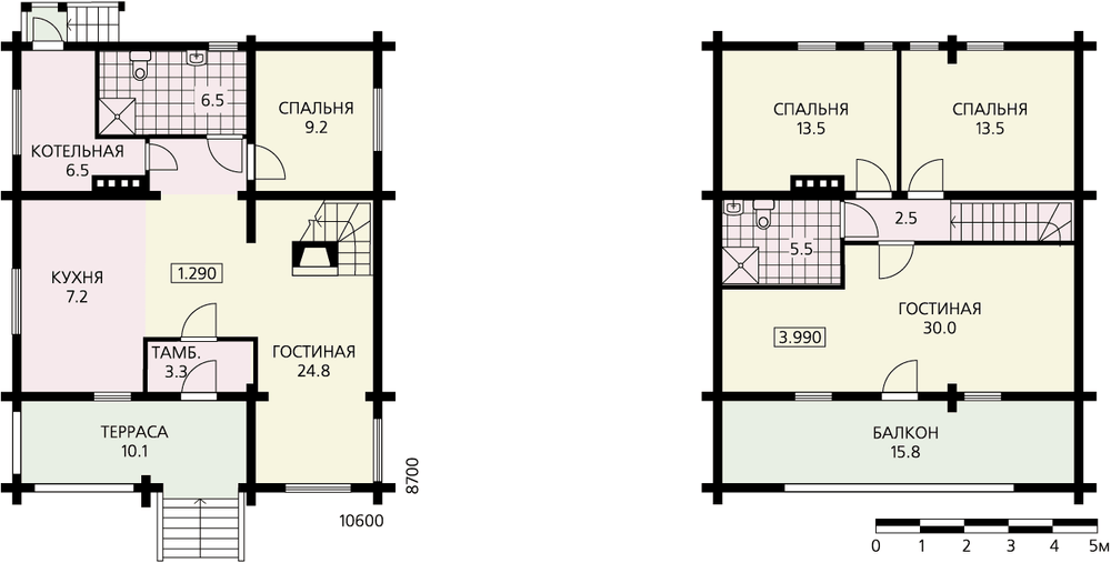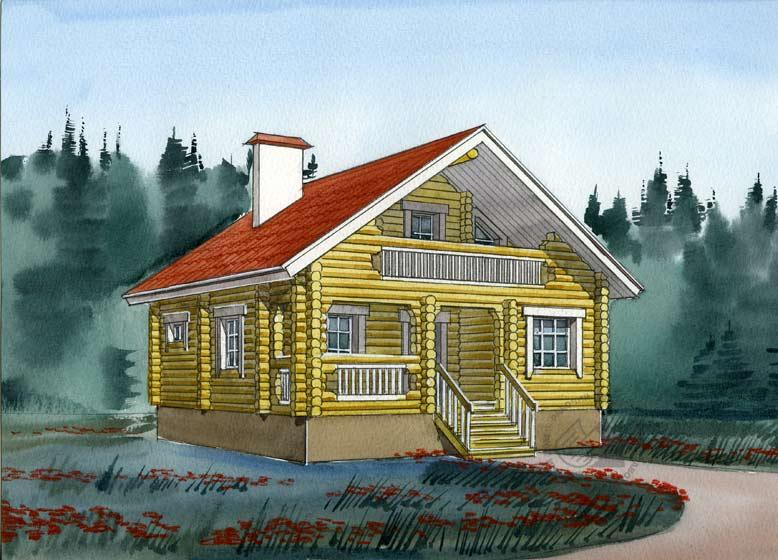 Небольшой бревенчатый дом с террасой и балконом. Планировка дома рациональна и лаконична, решена по принципу необходимой достаточности с минимальным количеством коридоров и холлов. Это позволило на небольшой площади дома разместить пять жилых комнат, кухню-столовую и служебные помещения. Вход в дом предваряет крытая терраса, минуя которую, через тамбур можно попасть непосредственно в гостиную. Хотя в данном случае гостиная и кухня-столовая представляют собой единое помещение, поэтому, попадая в дом, сразу оказываешься в гостевом пространстве. Гостиная оборудована камином, отсюда же деревянная лестница ведет в мансарду. Также на первом этаже расположены небольшая жилая комната, ванная и котельная со своим выходом на улицу. В мансарде запроектированы три спальни и ванная комната. Просторный балкон дополняет эту планировку. Дом более чем на метр приподнят над землей, но подвал отсутствует. Чердак очень маленький, и он не эксплуатируется.