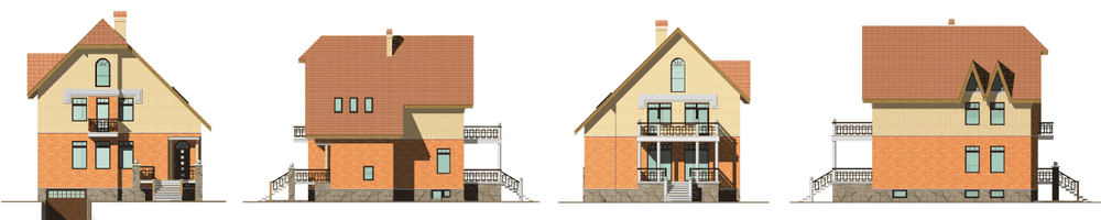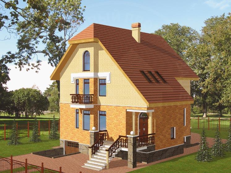 Большой, престижный особняк для состоятельной, многочисленной семьи. Его внешний облик традиционен, даже несколько консервативен, что, впрочем, никак не умоляет достоинств дома. Проектом предусмотрены три этажа и чердак. В цокольном, заглубленном на половину своей высоты этаже, расположены гараж, зона релаксации и небольшая котельная. Лестница соединяет этот этаж со всеми уровнями дома. Первый этаж – традиционно парадная, представительская часть дома. Здесь находятся гостиная, кухня- столовая, небольшая жилая комната. Приятным дополнением планировки этажа является просторная, крытая терраса, на которую можно попасть из гостиной и спальни. На втором этаже расположены четыре спальни и ванная комната. Из двух спален есть выход на просторный балкон – крышу террасы. При необходимости чердак можно оборудовать и использовать под жилые помещения.
