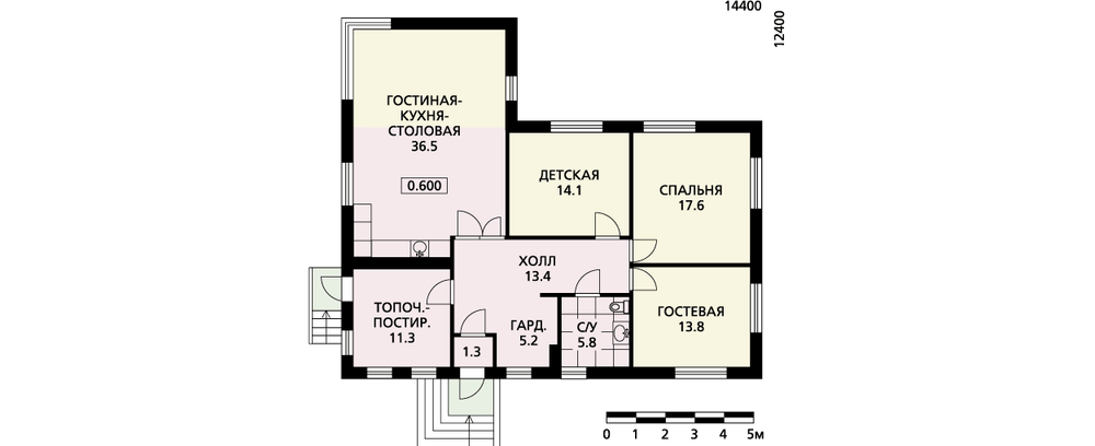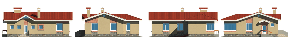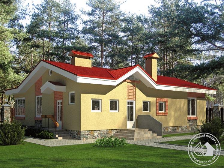 Этот небольшой одноэтажный дом как нельзя лучше подойдет для строительства на угловом участке. Его Г-образный план отлично впишется в красные линии такого участка. Следствием же того, что все помещения расположены на одной отметке, является достаточно большое пятно застройки, требующее и немаленького участка. Но в то же время отсутствие лестницы, съедающей значительную часть площади внутри дома, позволяет на одном этаже разместить все помещения, необходимые для жизни семьи. Планировка достаточно проста и лаконична, и, скорее всего, предполагает использование дома как сезонного жилья. Набор помещений представлен гостиной, совмещенной с кухней-столовой, детской, спальней и гостевой. Топочная, расположенная рядом со входом в дом, имеет отдельный выход на улицу. Подвал не предусмотрен, есть небольшой чердак, но он не эксплуатируется.