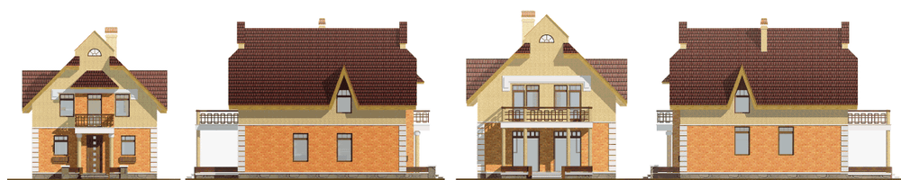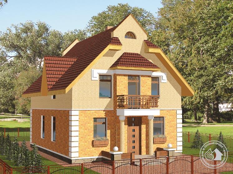 Достаточно лаконичный по своему решению дом рассчитан на одну немногочисленную семью. В доме два этажа, второй – мансардный. Подвал отсутствует, монолитная плита, заложенная в основание, позволит вести строительство на сложных грунтах. Есть небольшой чердак, на планах он не показан. Габаритные размеры дома очень небольшие, компактность пятна застройки нарушают далеко выступающие терраса и балкон, опирающийся на колонны. Если у вас небольшой участок, а дом вам приглянулся, то не стоит от него отказываться. Можно значительно уменьшить вынос выступающих элементов. На первом этаже дома половину всей площади занимает гостиная – большое прямоугольное помещение с трехсторонним освещением. Смежно с ним в алькове выделено место для кухни. Небольшая гостевая комната и кладовая при входе дополняют планировку. Спальная зона второго этажа решена лаконично, но при этом удобно для отдыха членов семьи. Здесь расположены три спальни и ванная комната.