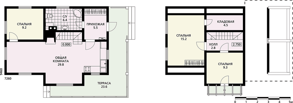 На первом этаже основную часть площади занимает гостевое пространство, объединившее гостиную, кухню и столовую. Остальная площадь поделена между прихожей, спальней и санузлом. На втором этаже расположены две спальни, одна из которых оборудована гардеробным шкафом, и кладовая.