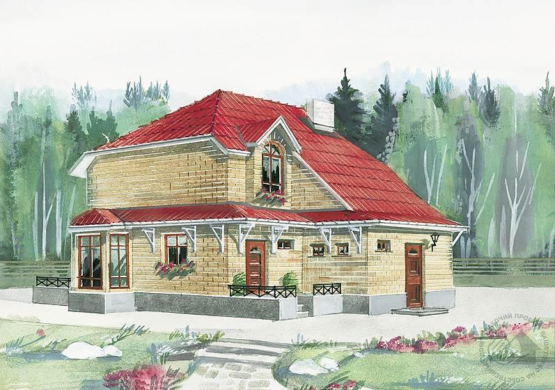 Выразительность облика этого компактного дома достигнута за счет многогранных эркеров, решения крыши и козырька-навеса. Первый этаж включает помещения дневного пребывания и блок подсобных и хозяйственных помещений. Многофункциональное пространство гостиной с двумя эркерами легко может быть зонировано. Не исключена возможность размещения во вспомогательных помещениях блока отдыха и развлечений, тем более что хозяйственные службы можно опустить в подвал. Второй этаж решен как мансарда. Вокруг небольшого холла здесь размещены три спальни и большая гостевая комната. При необходимости помещения, решенные в перегородках, можно объединить.
