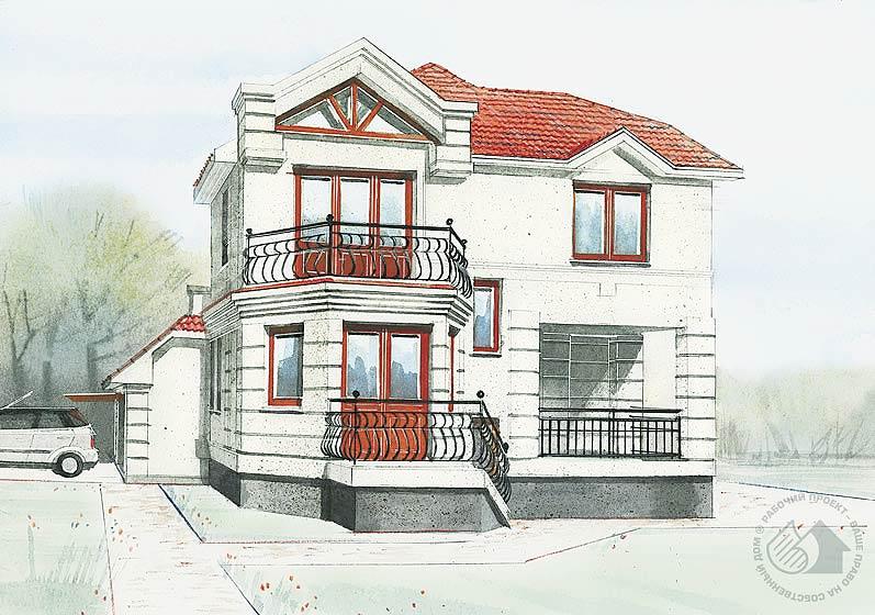 Компактный двухэтажный дом, стилевое решение фасадов которого делает возможным его строительство в черте города, исторических пригородах. Не менее привлекательно планировочное решение дома: просторная терраса-крыльцо при входе, удобная прихожая с арочным проемом, ведущим в гостиную, отсутствие коридоров, вместительная гардеробная при спальне, большая ванная комната. При нехватке жилых площадей на месте холла второго этажа возможно оборудовать еще одну спальню. Этот проект имеет подвальное пространство площадью 85.9 м2 (не включена в общую площадь), не показанное на планах. Использование в качестве строительного материала газобетонных блоков делает этот красивый дом достаточно экономичным.