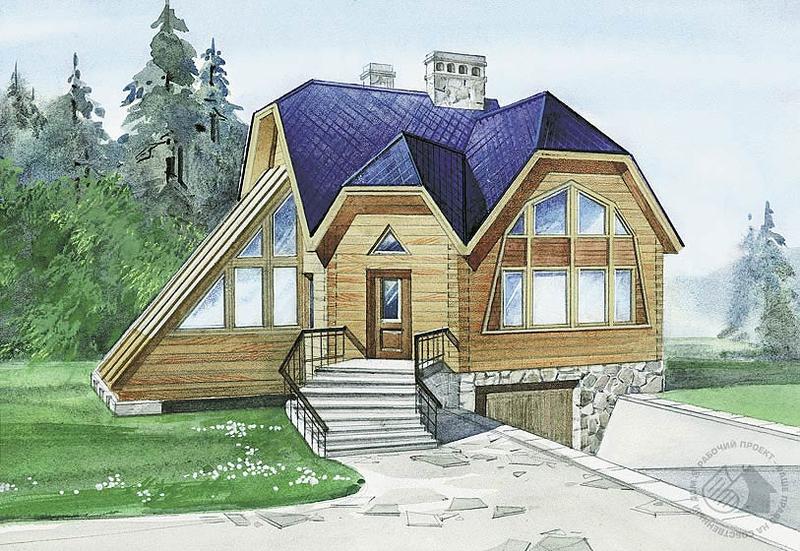 Компактный и очень экономичный дом для ценителей экологичного жилья. Наружные стены дома выполнены из бруса, и все конструкции дома тоже деревянные. Это упрощает строительство и делает дом доступным горожанам со средним уровнем доходов. Внутренние пространства решены изобретательно и дают основу для создания своеобразных интерьеров. Большая парадная гостиная с камином, открытой деревянной лестницей и хорошо освещающим помещение витринным окном будут радовать владельцев дома и гостей. Решение веранды с наклонным остеклением не только усиливает оригинальный облик дома, но и позволяет оборудовать на месте веранды оранжерею.