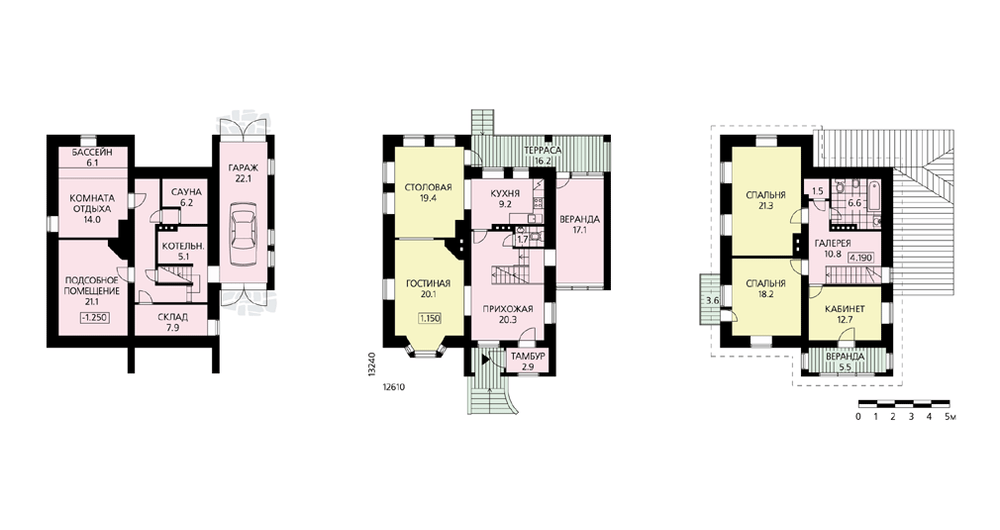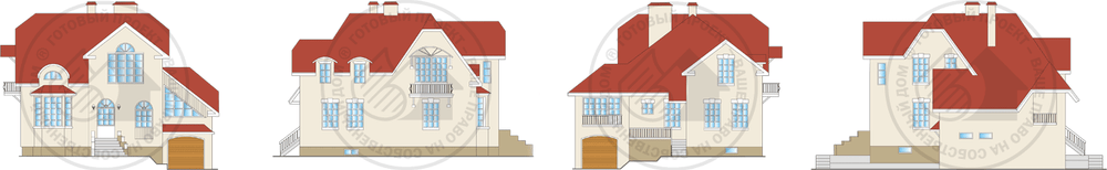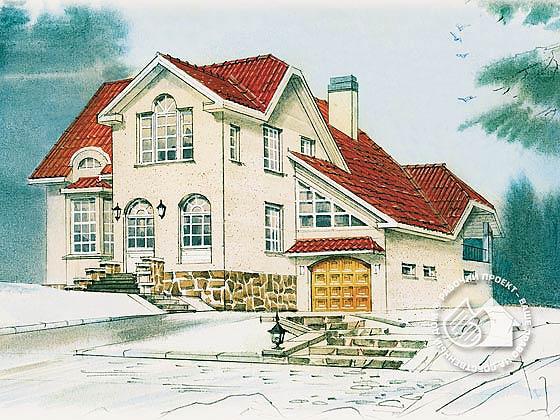 Дом идеально подойдет для строительства на участке с рельефом. Оптимальная конструктивная схема с одной внутренней несущей стеной позволит легко изменить планировку дома путем перестановки перегородок или отказа от некоторых из них. Объем камина, размещенного на пересечении основных помещений первого этажа, может стать более активной визуальной границей различных функциональных зон единого пространства гостиной-кухни-столовой. Неограниченные возможности изменения внешнего облика дома связаны с наружной отделкой: облицовка естественным камнем цоколя жилого объема может перейти на стены гаража, а также продолжиться до уровня опускающихся скатов крыши над гаражом. Вместо гаража может быть устроен навес для парковки автомобиля, что существенно удешевит строительство дома.