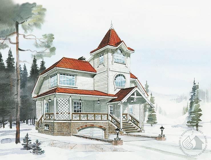 Компактный и экономичный двухэтажный дом, жилые этажи которого решены в экологичном материале – деревянном брусе. Нижняя часть дома – полуподвальный каменный объем, заглубленный на 1.2 м. Цокольный этаж использован для размещения гаража на два автомобиля, котельной, банно-оздоровительного комплекса с бассейном. Все помещения цокольного этажа имеют естественное освещение. Первый этаж решен традиционно – большая гостиная и изолированное помещение кухни-столовой. Просторная крытая терраса удобна для летнего отдыха. При желании ее легко остеклить, превратив в веранду. Второй – полумансардный – этаж состоит из трех спален, ванной и гардеробной. В башенке, на уровень которой можно подняться по лестнице из холла второго этажа, можно оборудовать библиотеку и кабинет.