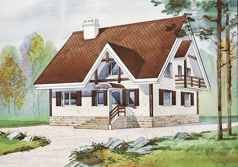 Компактность и экономичность в сочетании с комфортабельностью, несомненно, привлекут внимание к этому небольшому, очень симпатичному дому. В квадратный план изобретательно вписаны все помещения, необходимые для проживания небольшой семьи. Просторная двусветная гостиная имеет двустороннюю ориентацию, что дает большие возможности при привязке дома к конкретному участку. Второй свет гостиной можно рассматривать как резерв жилой площади дома. Мансарда – приватная зона дома. Для дополнительного освещения расположенных здесь трех спален, лестницы и санузла рекомендуем включить в проект мансардные окна Velux. А в крыше над двусветной гостиной можно расположить комбисистему из мансардных окон.