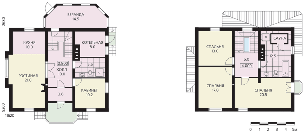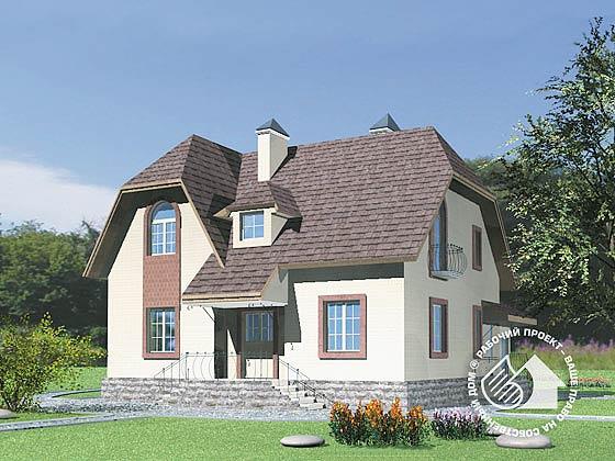 Гармоничность внешнего облика, небольшое пятно застройки при существенном выходе жилой площади – далеко не единственные достоинства этого дома. В основе сложного ярусного объема здания лежит простой прямоугольный план жилой части. Многогранный объем веранды – важный архитектурный акцент всей постройки. Просторный, хорошо освещенный центральный холл с симметрично расположенной лестницей – это распределительное ядро дома, из которого можно попасть во все его помещения. Парадная, c красивым эркером гостиная устроит самых взыскательных владельцев. Небольшие переделки позволят оборудовать вход в котельную непосредственно из дома.