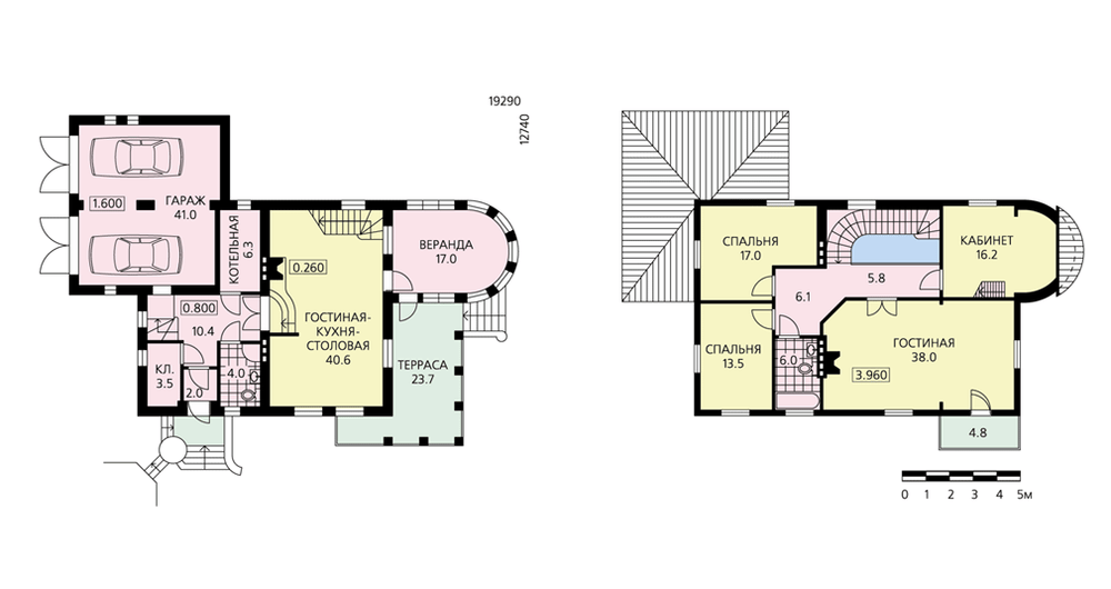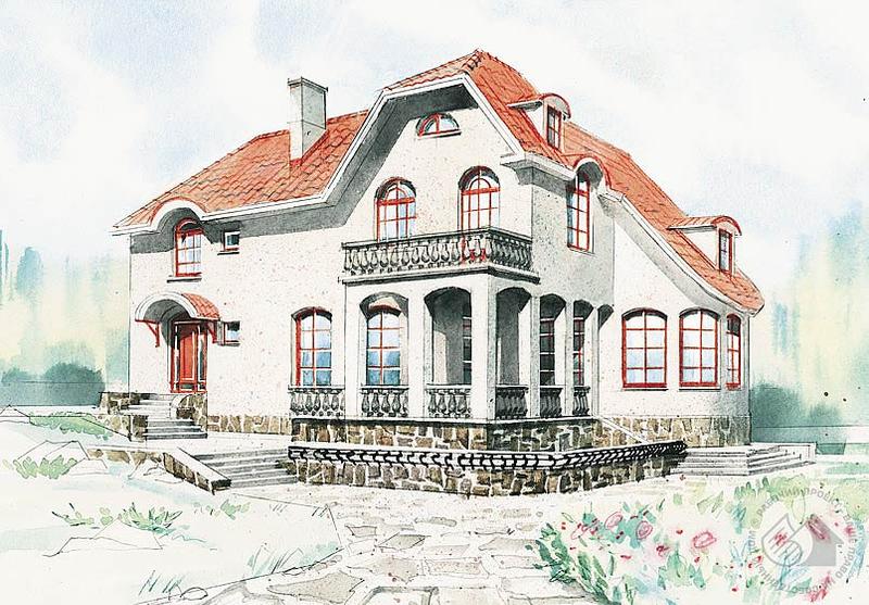 Респектабельность и высокий уровень комфорта – основные характеристики этого дома. Живописный облик формируется сложным силуэтом крыши, декоративной колоннадой веранды и арочными проемами окон. Терраса, веранда и балкон позволят владельцам наслаждаться живописным ландшафтом. Удобна связь с верандой. В доме один этаж и мансарда. Гостиная и кухня-столовая образуют единое помещение. В мансарде предполагается разместить вторую гостиную. Кроме нее здесь находятся две спальни, кабинет и ванная комната. При желании на месте гостиной мансардного этажа можно оборудовать еще две дополнительные спальни.