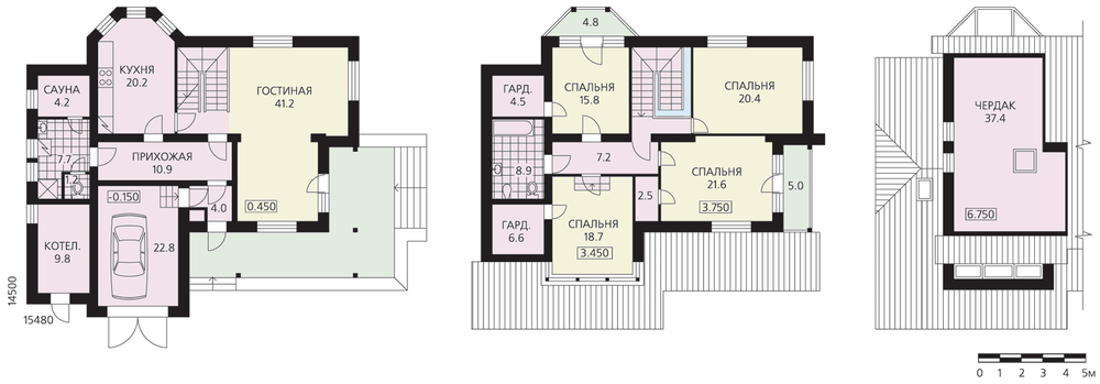 Прост и элегантен снаружи и необычайно удобен внутри. К тому же этот дом еще и универсален, его смело можно рекомендовать семье любого состава и любых возрастов. В планировке первого этажа отчетливо прослеживается деление на гостевую и служебную зоны, буфером между ними является небольшая прихожая. Площадь кухни вполне позволяет оборудовать здесь столовую, а гостиную при необходимости можно разделить на два помещения и оборудовать еще одну жилую комнату. Планировка второго этажа максимально рациональна, практически всю его площадь занимают четыре спальни, три из которых имеют гардеробные. Достаточно просторный чердак может использоваться по усмотрению хозяев дома. Небольшой подвал, расположенный под кухней, может служить погребом или хозяйственной кладовой.