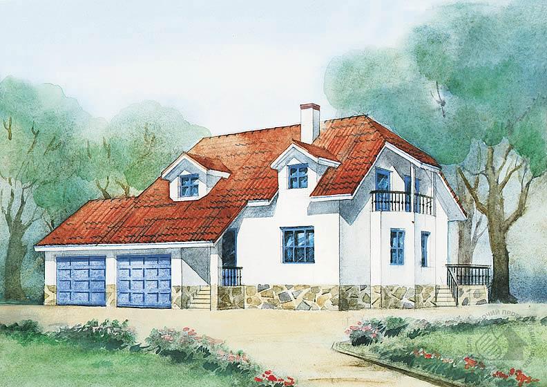 Сдержанность во внешнем оформлении и высокий комфорт проживания – так можно охарактеризовать этот дом. Объем жилой части постройки и гараж объединены общей крышей. Планировка жилой части строится вокруг открытой лестницы, расположенной в холле-прихожей. Вокруг этого холла группируются все необходимые блоки помещений, границы между которыми лишь обозначены. Мансардный этаж отличается повышенным уровнем комфорта: две большие ванные комнаты, гардеробные, спальни, оборудованные встроенными шкафами. Для освещения холла можно использовать мансардные окна Velux.