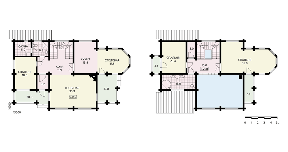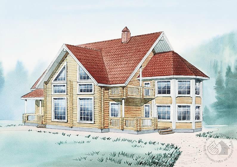 Просторный двухэтажный дом для семьи, мечтающей о просторном и комфортном загородном доме. Природный строительный материал – дерево – должен привлечь внимание горожан, способных оценить экологичность жилища. На первом этаже наряду с блоком помещений дневного пребывания находятся также спальня и сауна. Внутренняя лестница связывает первый этаж с мансардой и подвальным этажом, не показанным на планах, в котором владельцы могут оборудовать спортивный зал, подсобные помещения или что-то иное. Большая двусветная гостиная и столовая, расположенная в красивом эркере, – отличное место не только для отдыха большой семьи, но и для приема гостей. Холл второго этажа раскрывается на витражные окна гостиной. Котельная расположена в подвале.