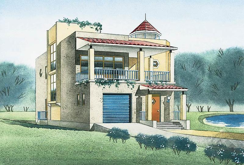 Перед вами дом с плоской кровлей, а это достаточно редкое явление среди предлагаемых нами проектов. Как правило, кровля выполняет функции ограждающей конструкции и элемента, формирующего силуэт здания, и очень редко бывает эксплуатируемой. В данном случае перед вами именно такой вариант. Крыша здесь является полноценной зоной отдыха. Вы можете проводить на ней свободное время, отдыхать, общаться с друзьями, загорать. В этом вам помогут беседка и пергола, оборудованные здесь же. Подняться на крышу можно по внутренней двухмаршевой лестнице. В остальном дом достаточно традиционен. На первом этаже расположены гостевая зона, гараж и котельная, на втором – спальни и большая крытая терраса.