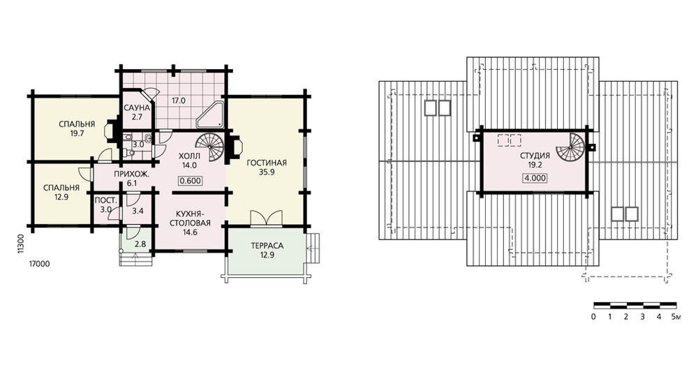 Брусчатый дом с обликом, характерным для усадебных построек, обладает целым рядом достоинств. Практически все его помещения расположены на первом этаже. Это может оказаться веским аргументом при выборе дома пожилыми людьми или горожанами, не любящими лестниц. Все помещения, включая постирочную и баню, запроектированы предельно компактно. В доме также есть небольшой подвал площадью 22.6 м2 (на планах не показан) и уютное помещение в мансарде, которое на планах обозначено как студия, но вполне может иметь и другое назначение. Несмотря на значительные размеры (11.3 х 17.0 м), дом очень экономичен не только из-за отсутствия второго этажа, но и благодаря применяемым строительным материалам.