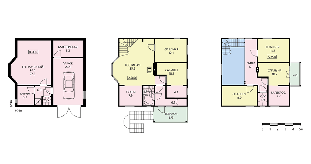 Дом спроектирован для участка с перепадом рельефа. Главный вход, организованный на уровне первого этажа, высоко поднят над землей. На первом этаже расположены помещения дневной зоны: просторная гостиная с камином и кухней-альковом. Дополняют планировку первого этажа два жилых помещения: кабинет хозяина дома и спальня. По открытой деревянной лестнице из гостиной можно подняться в мансарду. В мансарде расположены еще три спальни, они выходят на галерею, с которой открывается великолепный вид на второй свет гостиной. В цокольный этаж можно попасть с самой нижней отметки участка. Этот этаж отдан служебным помещениям дома, включающим в себя гараж, мастерскую, сауну и тренажерный зал.
