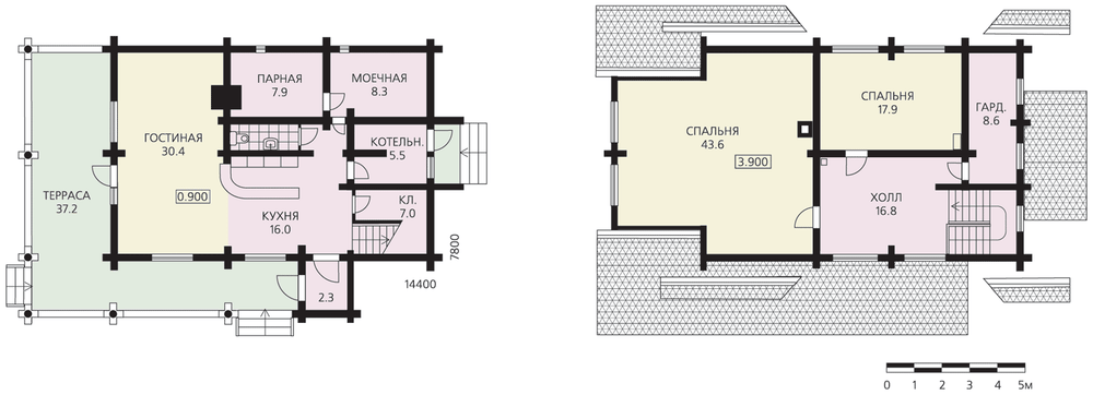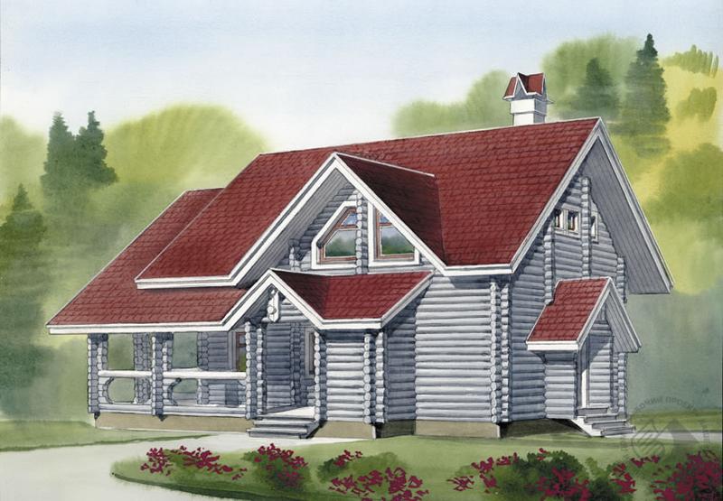 Этот бревенчатый дом с большой террасой может использоваться как загородный дом для семейного отдыха. Особенно хорошо он впишется в лесной ландшафт. Поднявшись на террасу через небольшой тамбур, можно попасть в дом. Небольшой входной холл образует с кухней-гостиной единое пространство. В доме есть еще один вход, через котельную. Если учесть, что в проекте предполагается автономное централизованное отопление от АГВ, которое занимает незначительную площадь, то котельную можно рассматривать как второй тамбур, а вход через него – как полноценный второй вход в дом. Дополнительно к перечисленным помещениям на первом этаже находятся парная, моечная и санузел. На мансардном этаже предлагается разместить две спальни и гардеробную. При необходимости здесь можно оборудовать санузел.
