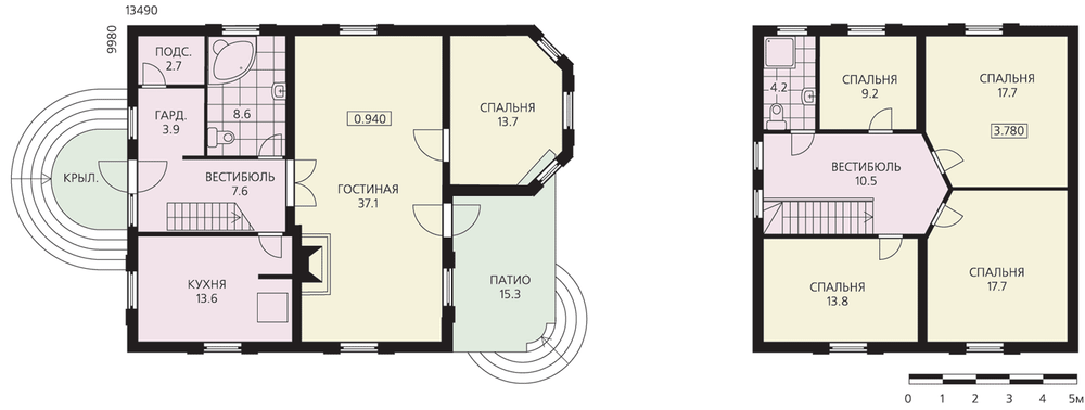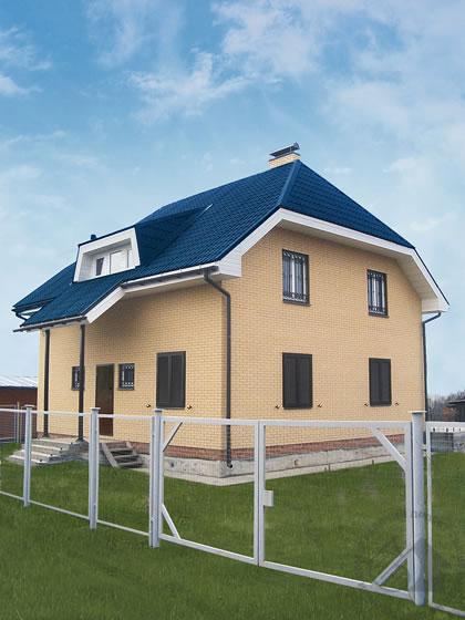 Перед вами дом, который задуман как компактный, экономичный объем, отличающийся при этом высоким уровнем комфорта. К квадратному в плане объему на первом этаже примыкает эркер, в котором находится смежная с гостиной спальня. Назначение этой комнаты может быть и другим, здесь можно разместить кабинет, библиотеку или, увеличив проем в гостиную, разбить зимний сад. В мансарде расположены четыре спальни и небольшой санузел, площадь которого может быть увеличена за счет смежной спальни. Полукруглая входная терраса с лестницей такой же формы и патио с противоположной стороны придают своеобразие облику этого лаконично решенного дома. В проекте не предусмотрено отдельное помещение для котельной, размещение обогревательного котла предлагается на площади кухни.