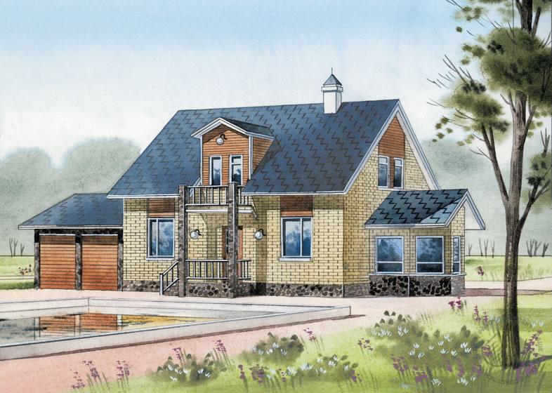Очень вместительный, комфортабельный и в то же время быстровозводимый и экономичный каркасный дом. От пристроенного гаража вполне можно отказаться или возвести его во второю очередь. Это не нарушит ни конструктивную, ни объемно-планировочную целостность здания. Можно также при сохранении гаража поменять местоположение ворот, переместив их на торцевую стену гаража. Планировка жилой части дома достаточно традиционна для загородного частного дома. Большая часть площади первого этажа отдана гостевой зоне. Это просторное, интересно решенное пространство с камином и эркером. В приватной зоне первого этажа находятся жилая комната и санитарно-гигиенический блок. Вся мансарда отдана спальной зоне дома, где, кроме трех спален, располагаются ванная комната и гардеробная.
