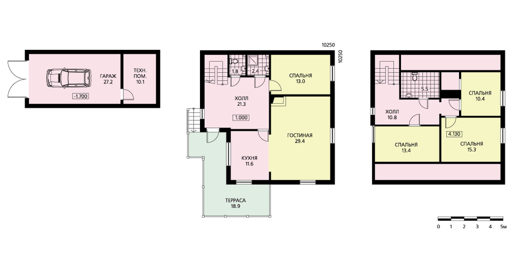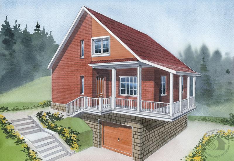 Перед вами один из вариантов дома, спроектированного для участка со значительным перепадом рельефа. В цокольной части дома, расположенной на нижней отметке, находятся гараж и техническое помещение, в котором может быть размещена котельная. С большой крытой террасы мы попадаем в холл первого этажа, который является распределительной зоной всего дома. Отсюда можно попасть в кухню-гостиную, в спальню первого этажа и подняться на мансарду, где расположены еще три спальни и большая ванная комната. В отделке фасадов, предлагаемых вашему вниманию, используются облицовочный камень, вагонка и лицевой кирпич. Использование других отделочных материалов может полностью изменить облик этого небольшого, комфортабельного каркасного дома.