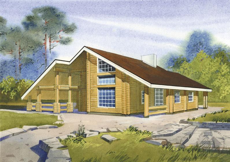 «Дом с навесами» – такое название вполне может носить этот деревянный дом. Несмотря на свою небольшую общую площадь, он имеет достаточно большое пятно застройки и как бы распластан по участку. Его внутреннее пространство гармонично сливается с окружающим ландшафтом, чему в немалой степени способствуют большие выступающие навесы. Функционально внутренняя планировка организована так, что вся жизнь дома сосредоточена на его первом этаже. Большая, если не сказать огромная, двусветная гостиная с камином занимает львиную долю площади всего этажа. Здесь и протекает вся дневная жизнь обитателей дома. Оставшаяся площадь поделена между двумя спальнями и блоком служебных помещений. По открытой лестнице из гостиной можно подняться на мансарду, где всего одна небольшая спальня.
