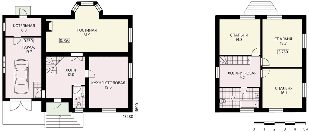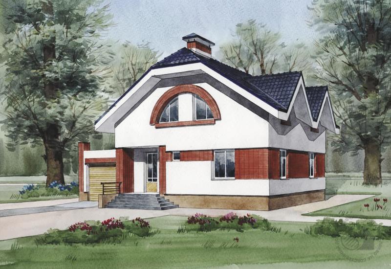 Предлагаемый вариант унаследовал все достоинства своего предшественника, он так же компактен, рационален, имеет простые, но достаточно выразительные фасады. В данном проекте несколько увеличена площадь гостиной и изменено местоположение камина. Изменены форма и габариты эркера в гостиной, он стал пятигранным и большей площади. Кухня-столовая и гостиная не имеют непосредственной связи между собой, но при необходимости их можно объединить с помощью проемов в стене. В этом варианте тоже отсутствует подвал и максимально рационально используется подстропильное пространство. Гараж, который является пристройкой, может быть возведен во вторую очередь, уже в период эксплуатации дома.