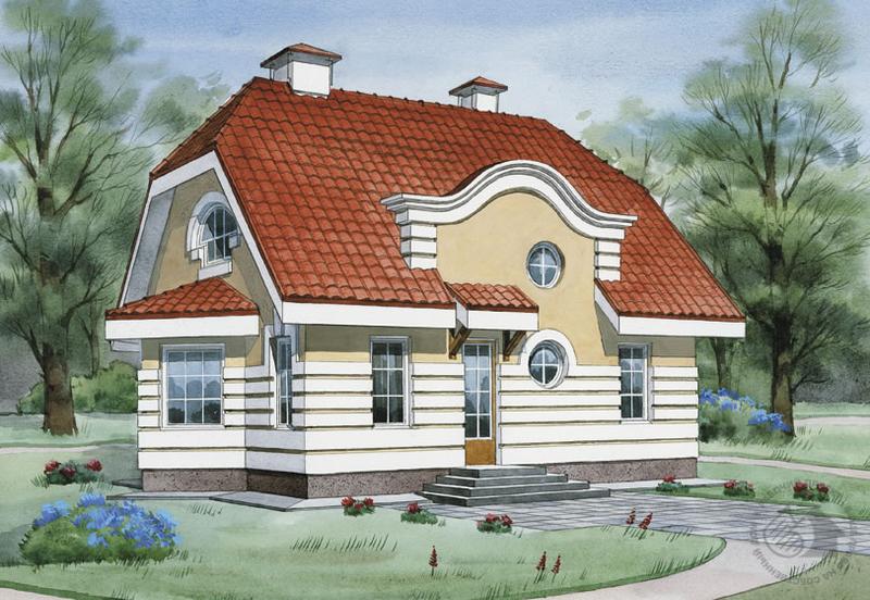 Особняк с элементами модерна, небольшой, не сложный по своему объемно-планировочному решению, но очень красивый. Рустовка фасадов, круглой формы окна, декоративные элементы, высокий силуэт кровли создают очень выразительный, неповторимый образ дома. Это удачный пример сочетания рационального подхода и эстетики в решении архитектурного объекта. Причем все фасады дома одинаково интересны. В доме два этажа, один из которых мансардный. В планировке не ставилась задача поэтажного зонирования, поэтому гостевая зона на первом этаже соседствует со спальными комнатами. Гостиная и кухня представляют единое пространство, лишь визуально поделенное камином. В мансарде расположены одна спальня, просторная ванная комната и гардеробная, которая также может использоваться как спальня.