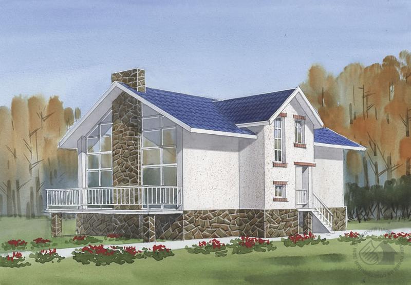 проект дома, специально спроектированного для узкого участка. В плане он представляет собой вытянутый прямоугольник. И хотя главным фасадом является продольный, с которого решен вход в дом, наиболее интересны торцевые фасады. Так, фасад со стороны гостиной имеет огромный двусветный витраж, благодаря которому внутреннее пространство наполняется воздухом и солнечным светом. А попадаем мы на первый этаж по достаточно высокой лестнице, так как над поверхностью земли дом возвышается на полтора метра. На первом этаже, кроме гостиной, расположены две спальни и ванная комната. Небольшая кухня отделена от гостиной барной стойкой. Из гостиной же можно подняться на мансардный этаж, где расположены две спальни и кабинет. Интересным и необычным представляется решение кабинета. Свет сюда проникает через мансардные окна и остекленный витраж, заменяющий перегородку со стороны второго света гостиной.