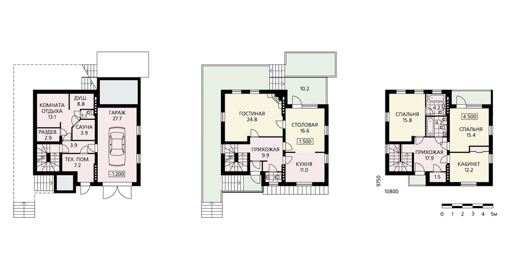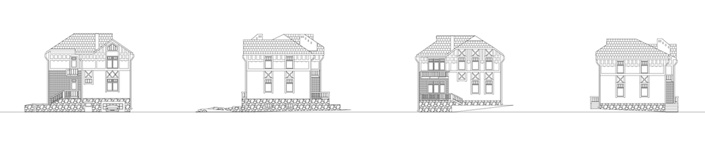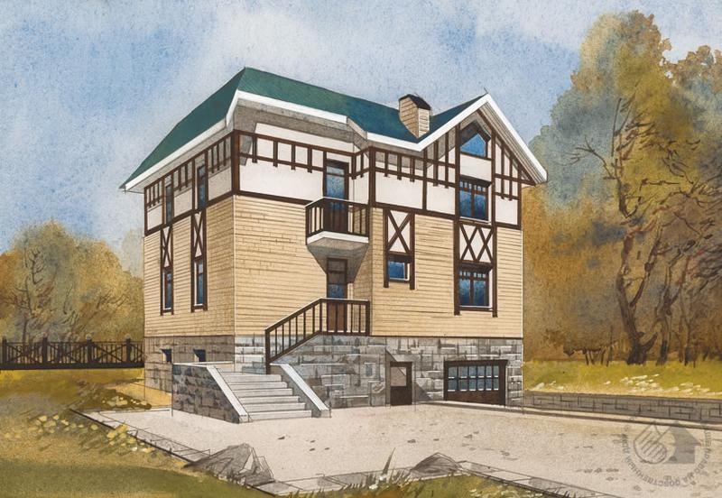 Рациональность и компактность – девиз этого проекта, причем относится это как к внешнему облику дома, так и к его внутренней планировке. Впрочем, рациональный подход в данном случае применен отнюдь не в ущерб комфорту и внешней привлекательности. В доме три полноценных этажа и чердак. Планировка имеет четкое поэтажное зонирование, традиционное для коттеджа такого класса. Площадь цокольного этажа поделена между гаражом и служебными помещениями. Первый этаж полностью отдан зоне дневного пребывания семьи с просторной гостиной и кухней-столовой. От прихожей гостиную отделяет перегородка, от нее можно отказаться совсем или заменить стеклопакетами, получив, таким образом, светлую прихожую. Второй этаж решен с учетом самых высоких требований к уровню комфорта, здесь на три небольшие спальни приходятся две ванные комнаты и кладовая. Одна из спален имеет балкон.