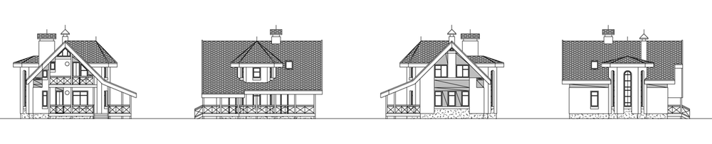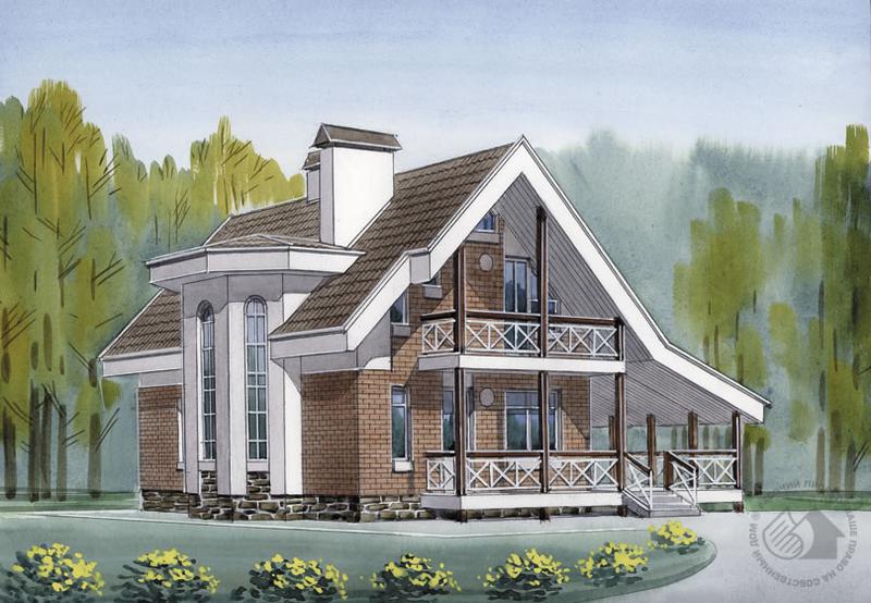Рационализм планировочного и конструктивного решения в сочетании с пластичным объемом – отличительные черты этого небольшого загородного особняка. Два пятигранных эркера, расположенные на противоположных фасадах, – основные элементы, формирующие как внешний облик дома, так и его внутреннее пространство. К таким элементам можно отнести и террасу, охватывающую сразу два фасада дома. С этой террасы организован вход в дом, на нее можно выйти из гостиной и кухни-столовой. Заказчики, ценящие нестандартные решения, должны обратить внимание на организацию зоны дневного пребывания на первом этаже. Гостиная, кухня-столовая и холл решены как единое пространство, центральное место в котором отведено камину. При желании каждое из этих помещений можно сделать изолированным, разделив перегородками с дверными проемами. Две спальни и ванная комната занимают почти всю площадь мансардного этажа.